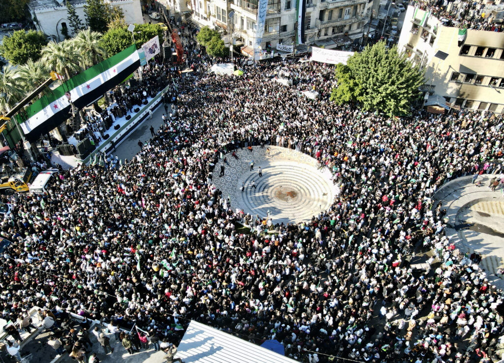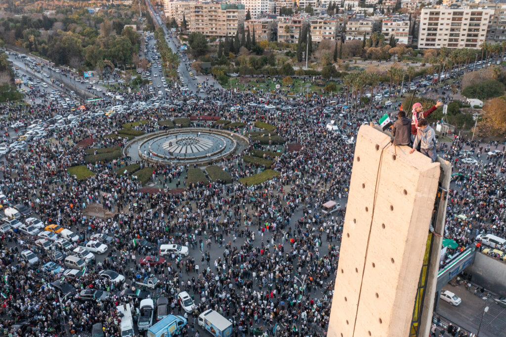 DAMASCUS, SYRIA – DECEMBER 13: An aerial view of crowd as people, holding “Syrian revolution flags,” gather in Umayyad Square to continue celebrating the collapse of the 61-year-long Baath regime and the end of the Assad family era on December 13, 2024 in Damascus, Syria. ( Emin Sansar – Anadolu Agency )DAMASCUS, SYRIA – DECEMBER 13: People gather in Umayyad Square to continue celebrating the collapse of the 61-year-long Baath regime and the end of the Assad family era, waving “Syrian revolution flags,” on December 13, 2024 in Damascus, Syria. ( Emin Sansar – Anadolu Agency )