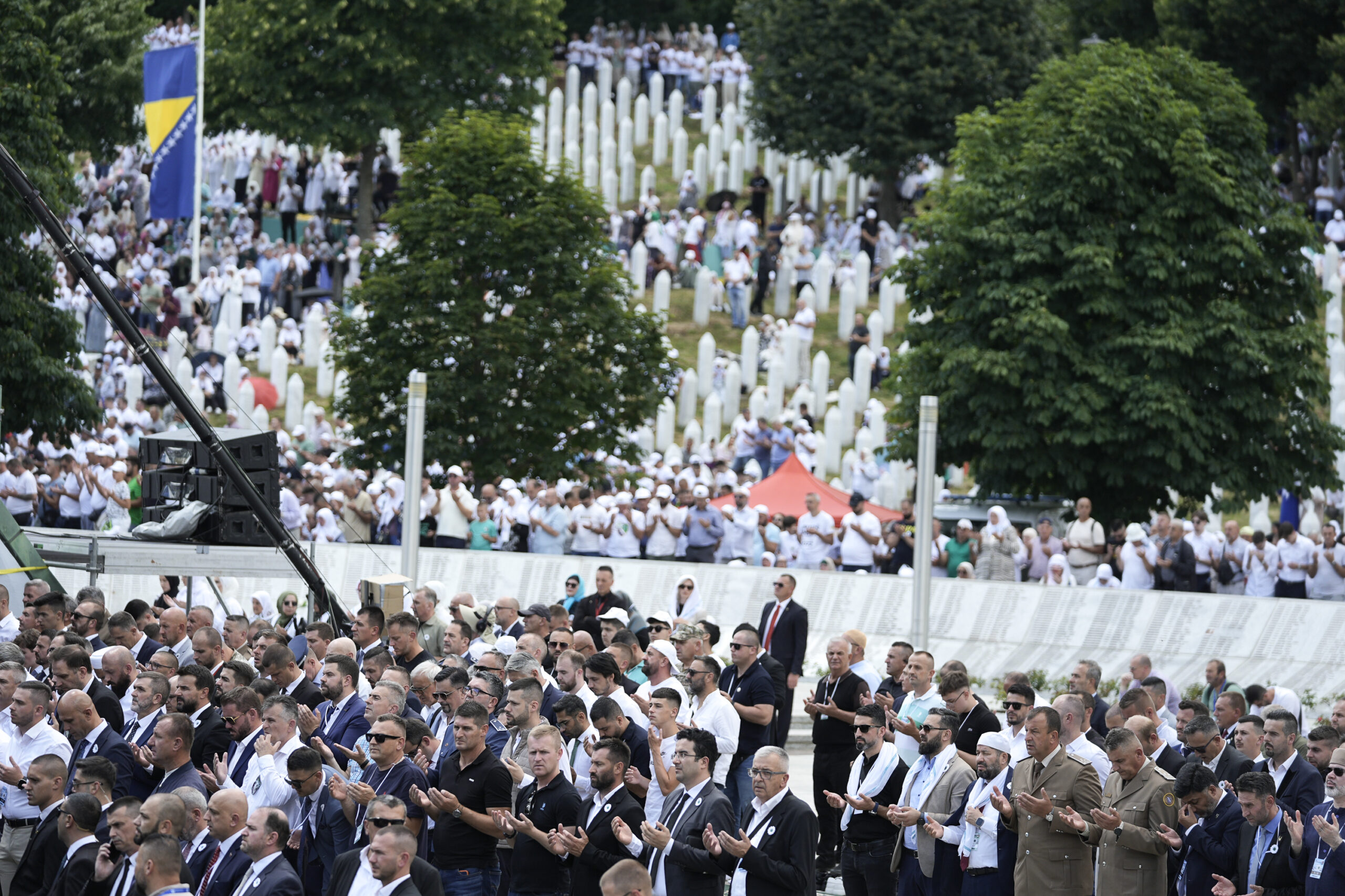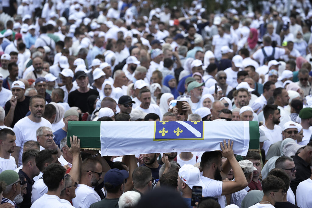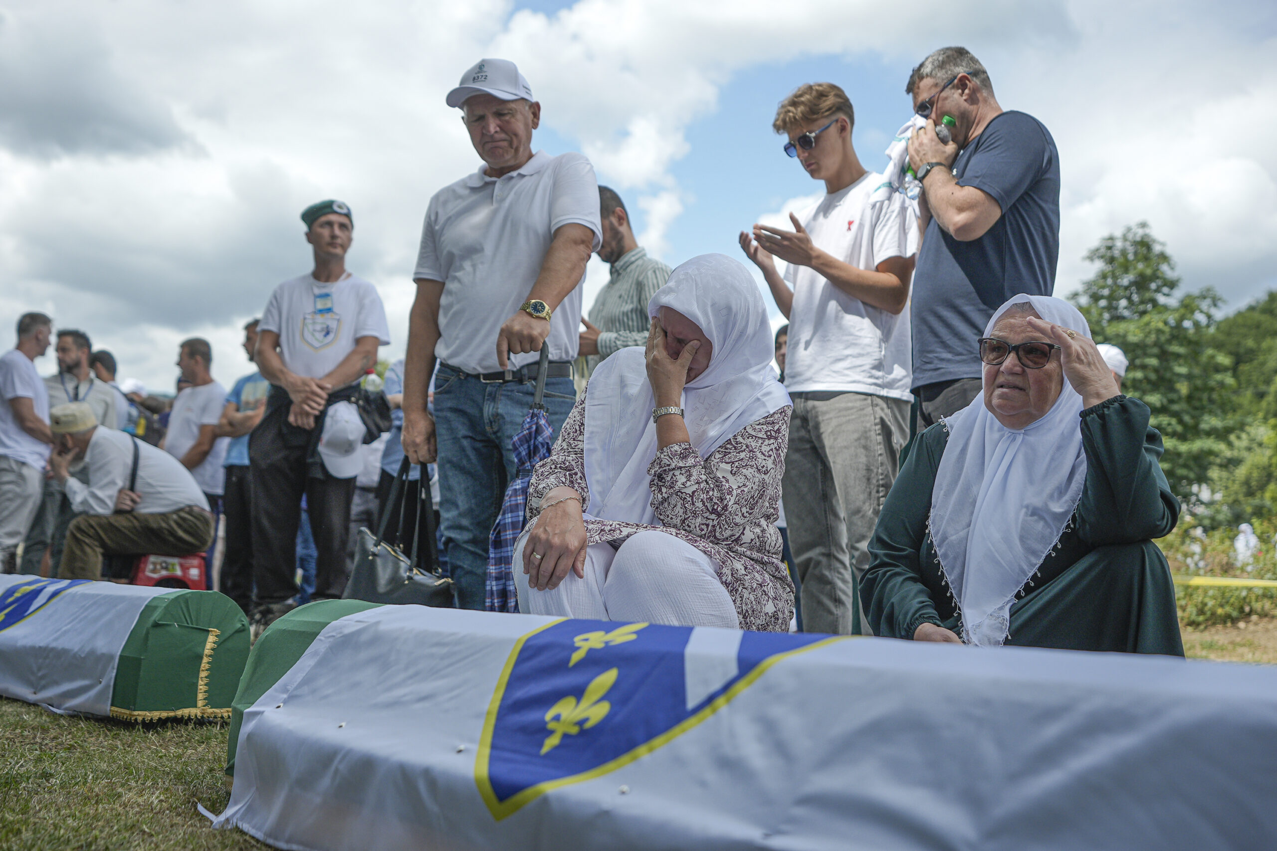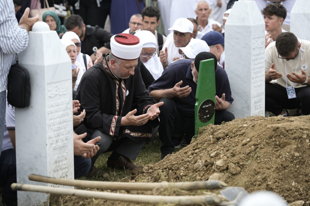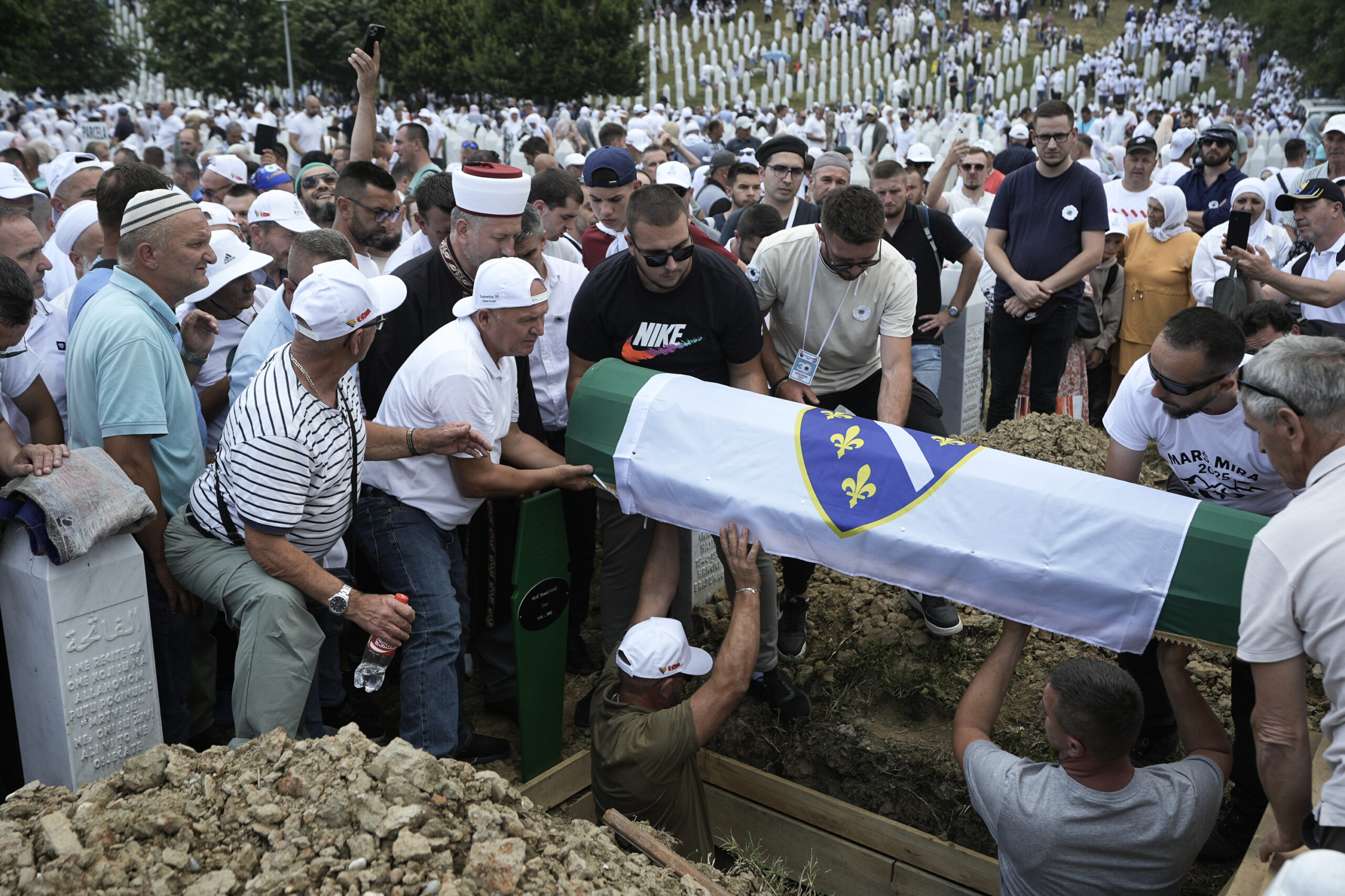 Mourners attend the funeral of seven victims of the 1995 genocide during a burial ceremony at the Potocari Memorial Cemetery in Srebrenica, Bosnia and Herzegovina, on July 11, 2025.