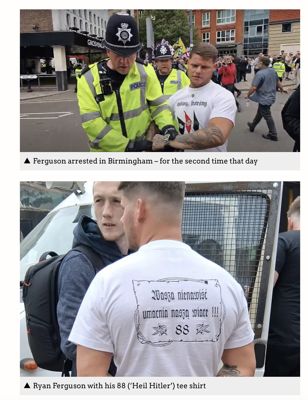 But in a picture provided to the ECHO by campaign group HOPE not hate, Ferguson is seen wearing a T-shirt with a Polish slogan and the numbers “88.”