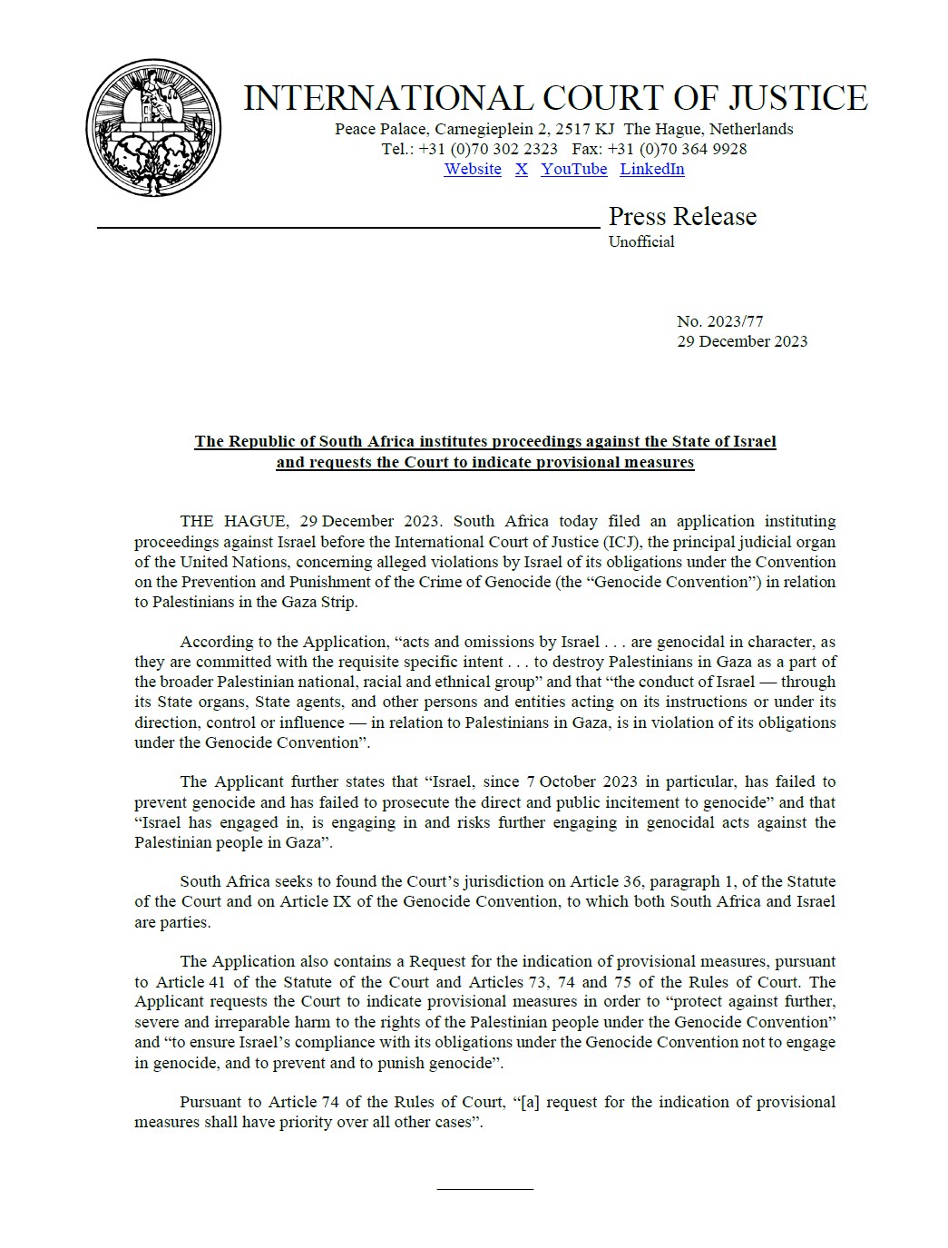 The application filed “concerning alleged violations by Israel of its obligations under the Convention on the Prevention and Punishment of the Crime of Genocide in relation to Palestinians in the Gaza Strip,” the ICJ said in a press release.