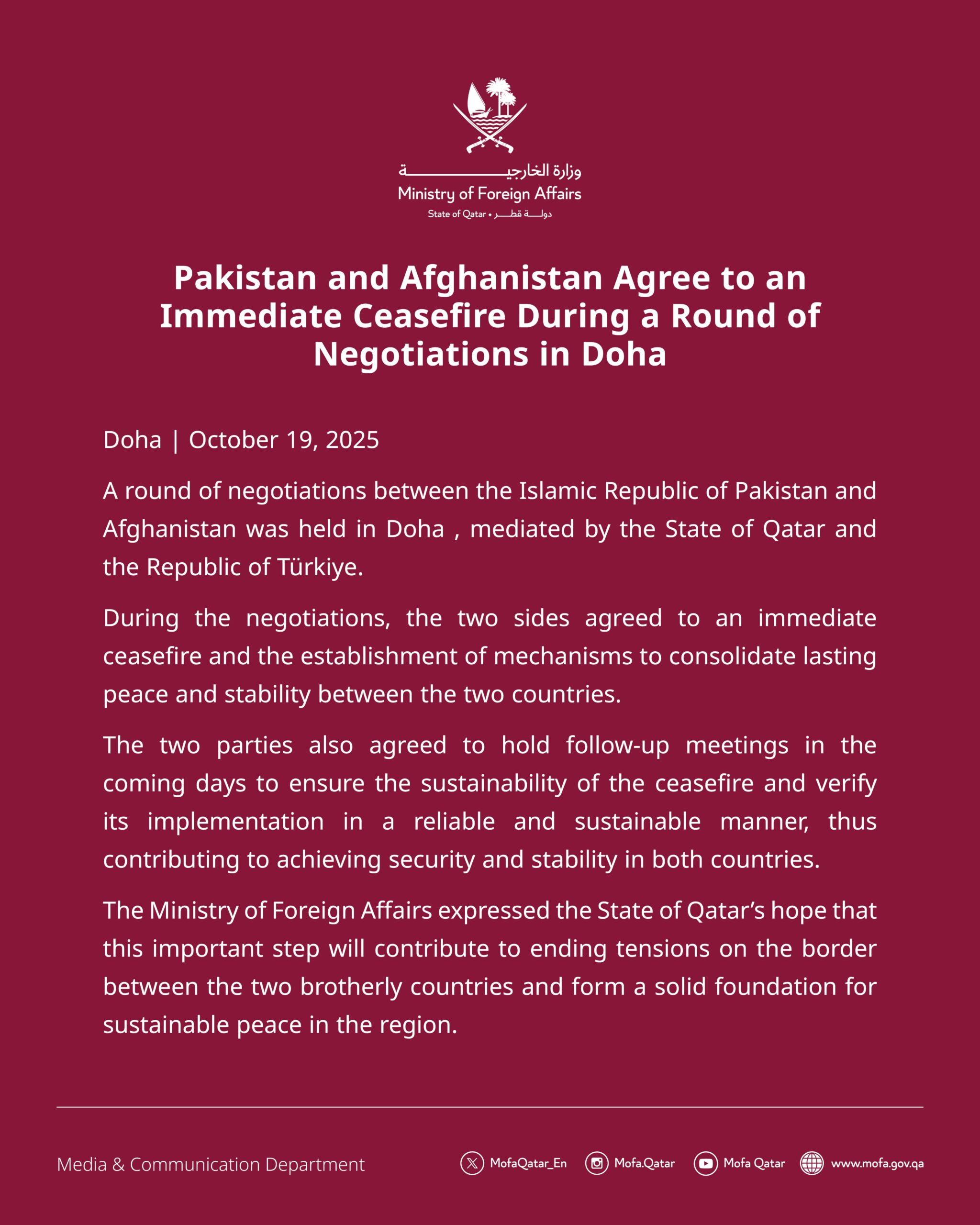 The spokesman for the Islamic Emirate of Afghanistan (IEA), Zabihullah Mujahid, confirmed that the parties had agreed on a “complete and meaningful ceasefire.” Qatar’s foreign ministry said the upcoming meetings would aim “to ensure the sustainability of the ceasefire and verify its implementation in a reliable and sustainable manner.”