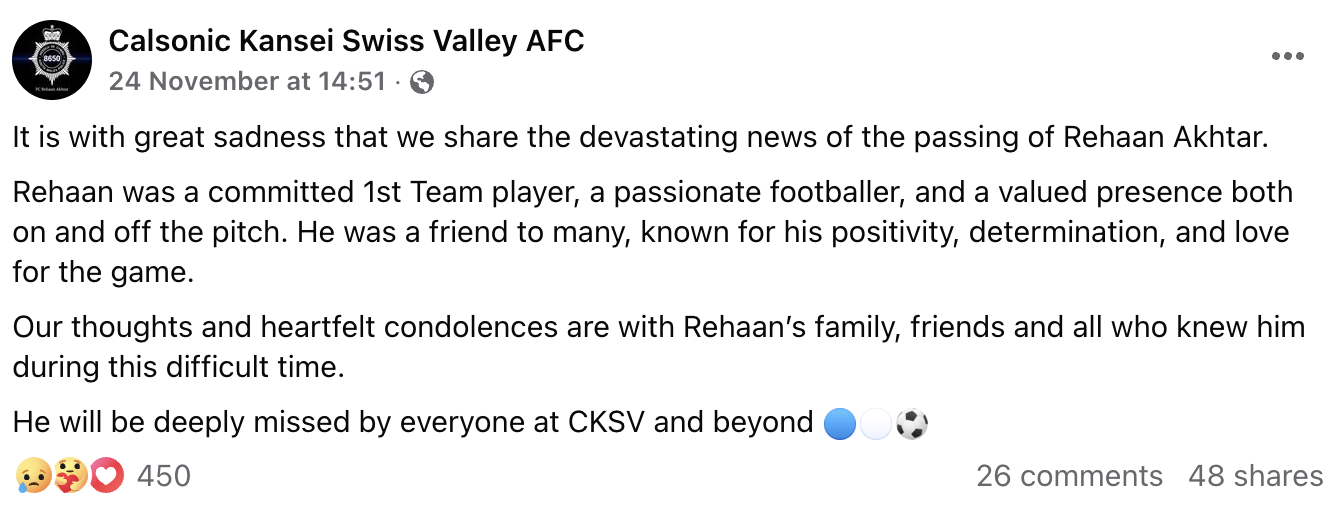 Akhtar’s local football team, the Llanelli-based Calsonic Kansei Swiss Valley AFC, who Akhtar played football for, also issued their own tribute to him on social media.