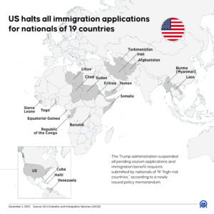 Internal guidance sent to immigration officers ordered them to “stop final adjudication on all cases” relating to applicants from the listed countries and to pause naturalisation ceremonies for migrants who were due to obtain US citizenship in the coming days.