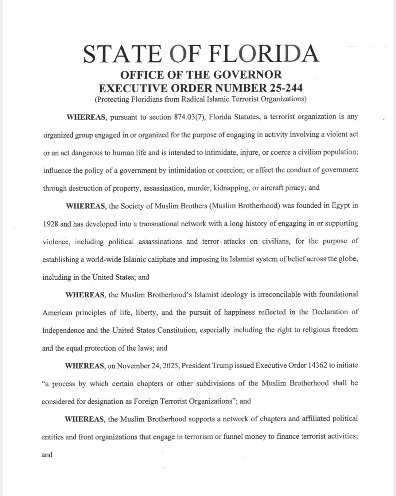 The Republican governor of Florida has designated the Islamic political movement, the Muslim Brotherhood, and the Muslim civil rights group, the Council on American-Islamic Relations (CAIR), as foreign terrorist organisations.