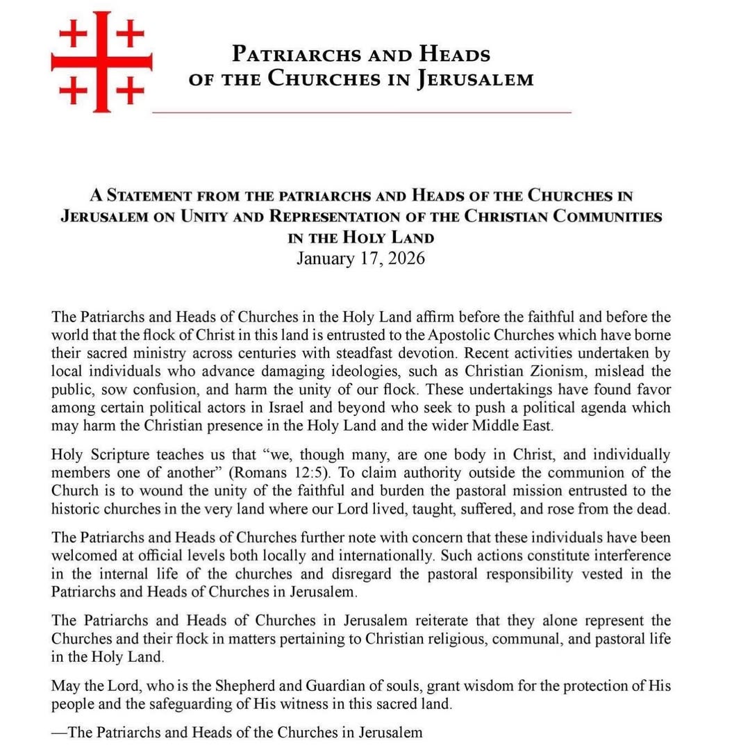 The Patriarchs and Heads of Churches in the Holy Land affirmed in a statement released on Saturday that recent activities by local individuals advancing “damaging ideologies, such as Christian Zionism”, which mislead the public, sow confusion, and harm the unity of our flock.