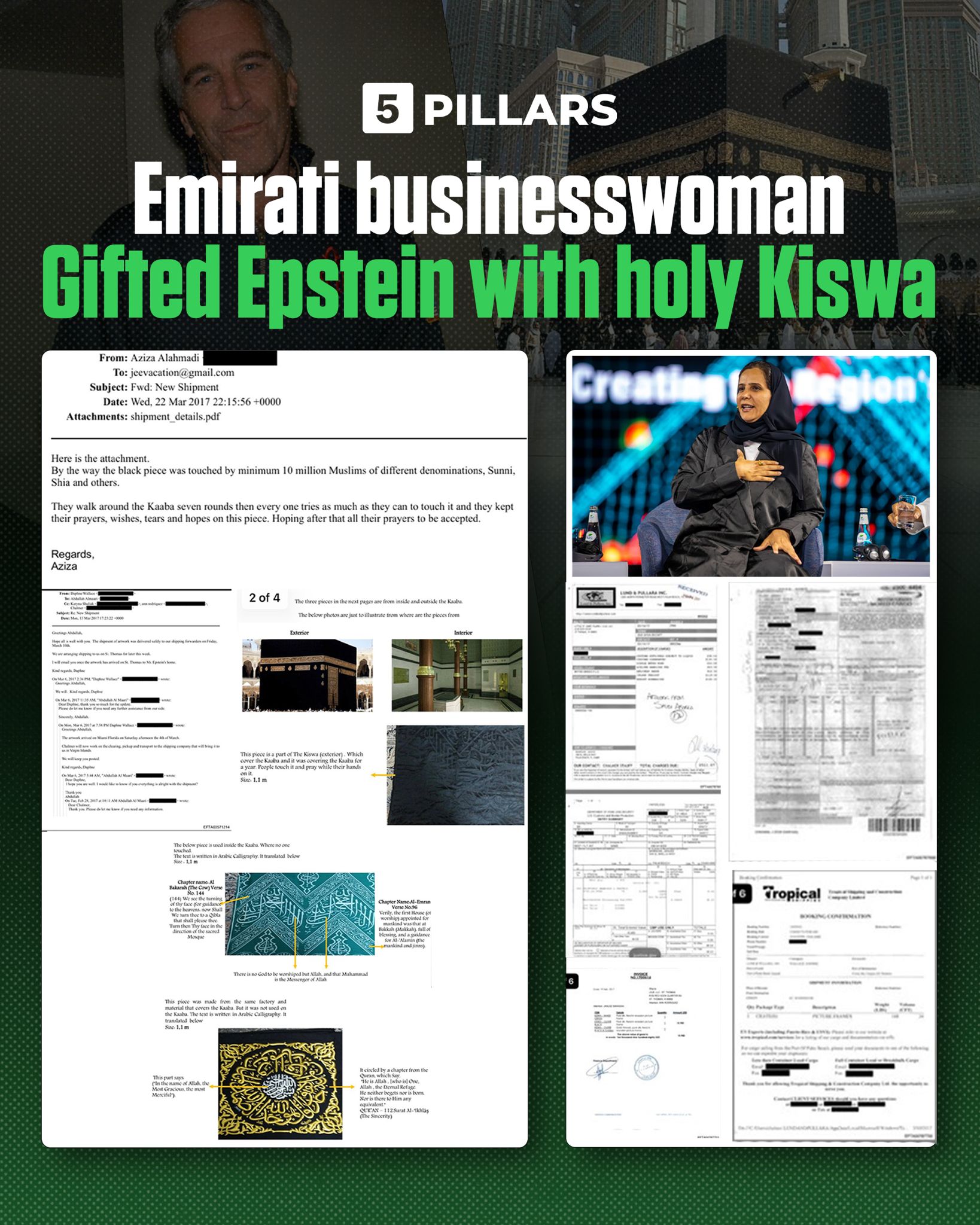 An email correspondence found in the Epstein Files details a shipment of the Kiswa, the black and gold embroidered cloth which shrouds the Kaaba in Makkah’s Masjid al-Haram, which was arranged to be delivered to convicted paedophile Jeffrey Epstein via UAE-linked contacts.