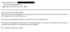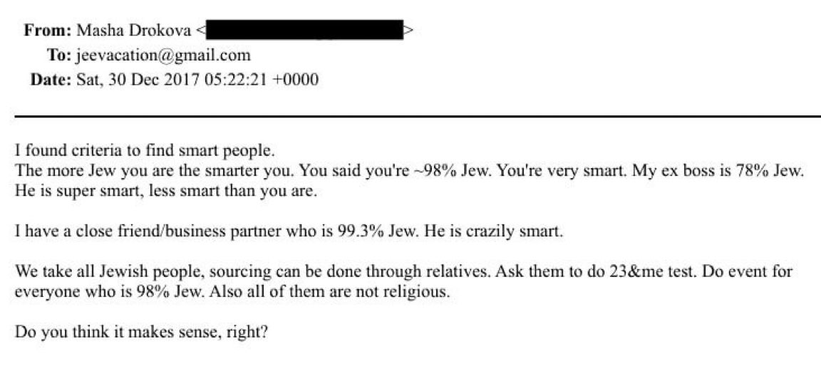 In one email about eugenics, Masha Drokova said to Epstein: “I found criteria to find smart people. The more Jew you are the smarter you are.” She went on to tell Epstein how he should only work with genetically tested Jews.