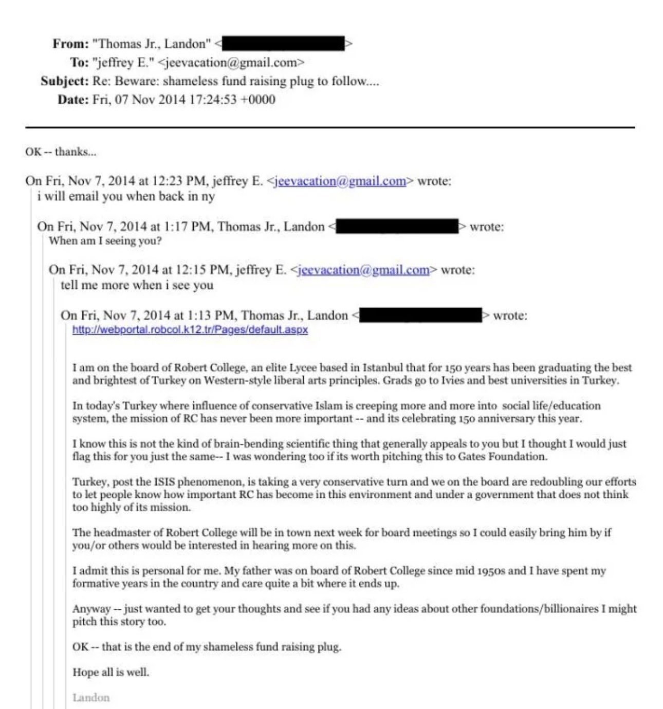 Bill Gates and other powerful billionaires were reportedly enlisted to suppress the influence of conservative Muslims in Türkiye. Landon Thomas Jr., a board member of Robert College, a French lycée secondary school in Istanbul, Türkiye, sought donations and fundraising advice from Jeffrey Epstein.