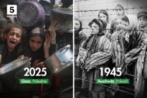 The image was labelled “Palestine 2024” alongside what appeared to be a World War Two concentration camp labelled “Germany 1945”. The caption of the post read: “The world said never again and here we are again 79 years later.”