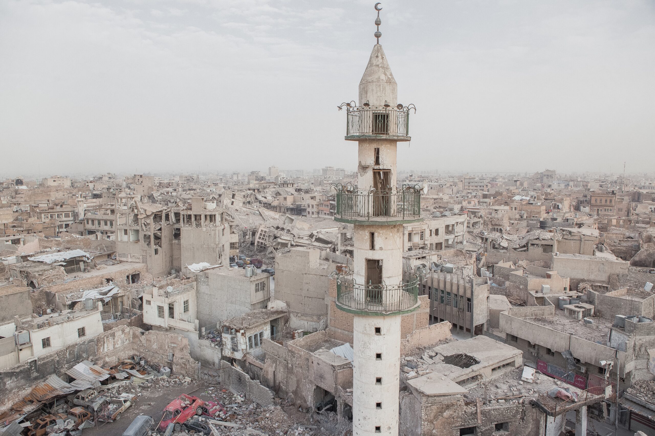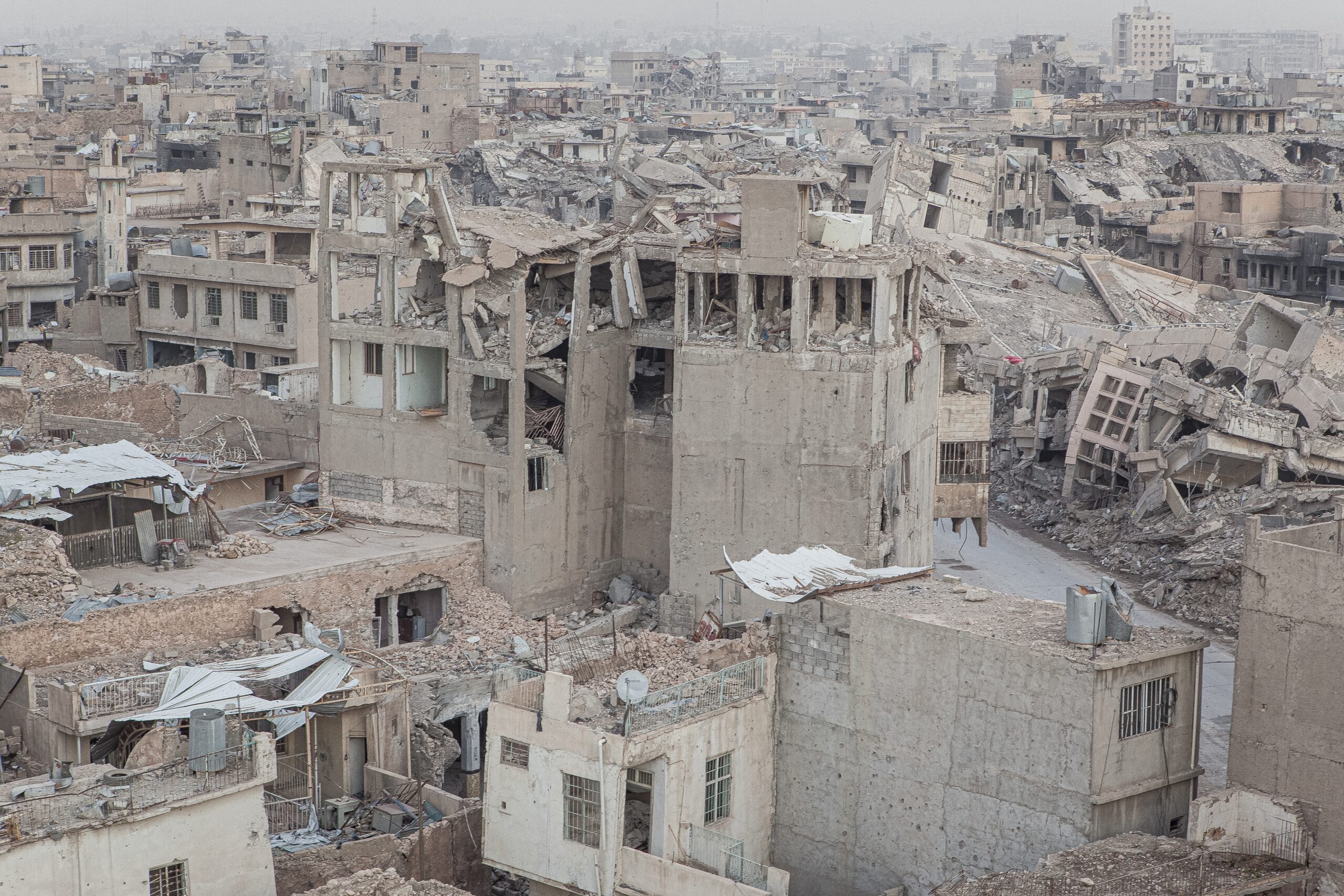 Mosul was devastated during the three-year occupation by ISIS from 2014 to 2017 and the subsequent Battle of Mosul, where intense street-to-street fighting, airstrikes, and deliberate demolition of buildings, including historic mosques and infrastructure, left much of the city in ruins and displaced over a million residents.