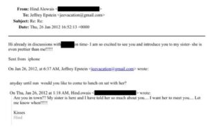 In one email from Al-Owais to Epstein, she wrote: “Hi, already in discussion with [redacted] on time – I am so excited to see you and introduce you to my sister – she is even prettier than me!”