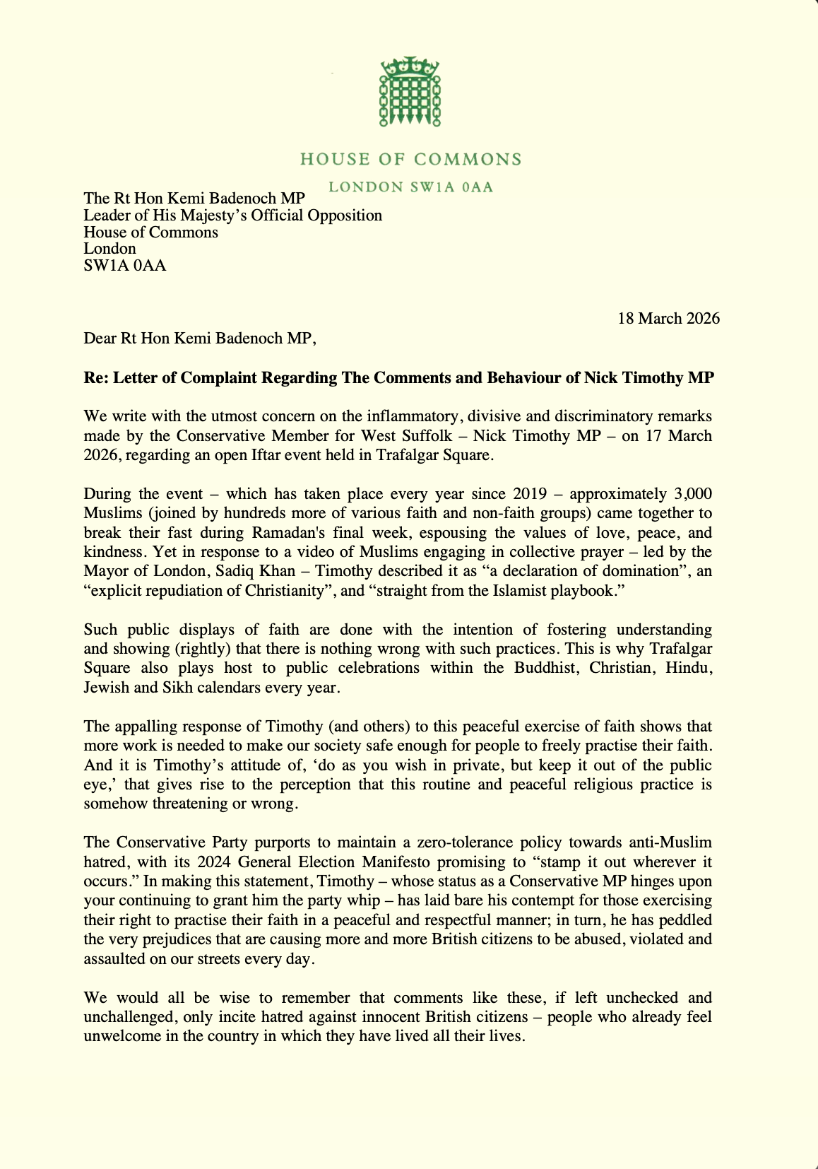 Today, Muslim MP Ayoub Khan has published a cross-party letter demanding that Conservative leader Kemi Badenoch condemn the Islamophobic comments made by her Shadow Justice Secretary, Nick Timothy, describing an Iftar event at Trafalgar Square as “a declaration of domination.”